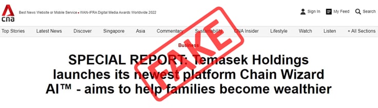 These claims are false and Temasek is not associated with “Chain Wizard AI” in any way. The websites are designed to mimic a news article, while the videos are digitally manipulated (deepfakes), to mislead viewers.