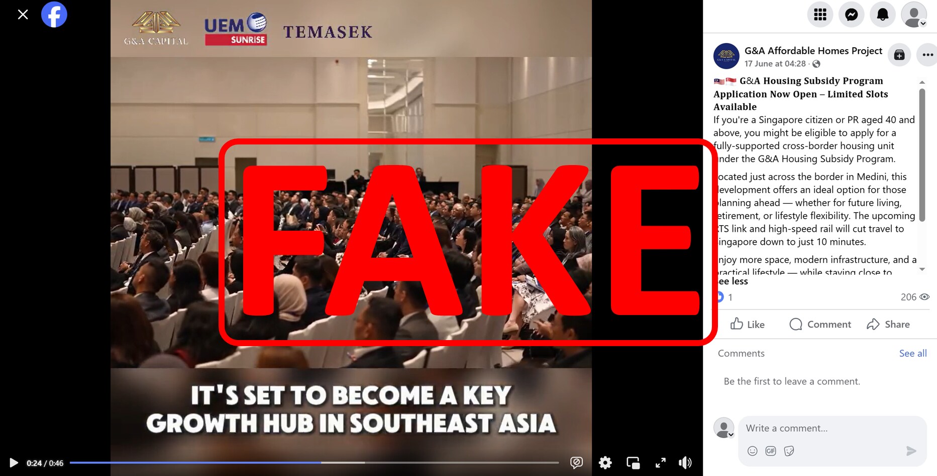 The scammers, using the name “G&A Affordable Homes Project”, claim to represent a joint venture between Temasek and UEM Sunrise and are promoting the sale of apartments in Medini Iskandar. They are soliciting personal and financial information from individuals for the purpose of receiving deposits for the housing project.