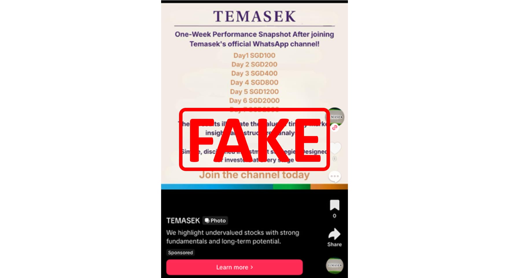 We have been alerted to a TikTok advertisement that invites viewers to join Temasek’s “official WhatsApp channel” to earn money.