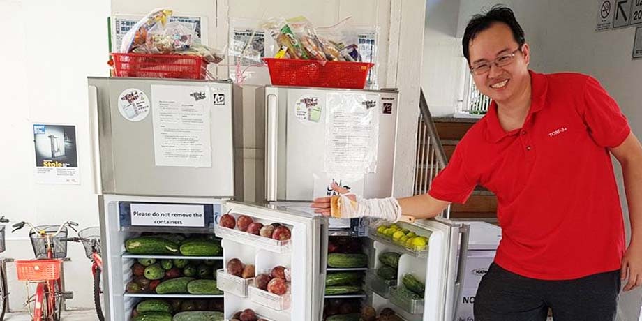 Daniel Tay, co-founder of SG Food Rescue, at one of the many community fridges that the group frequently restocks with unsold vegetables (Photo: Daniel Tay)